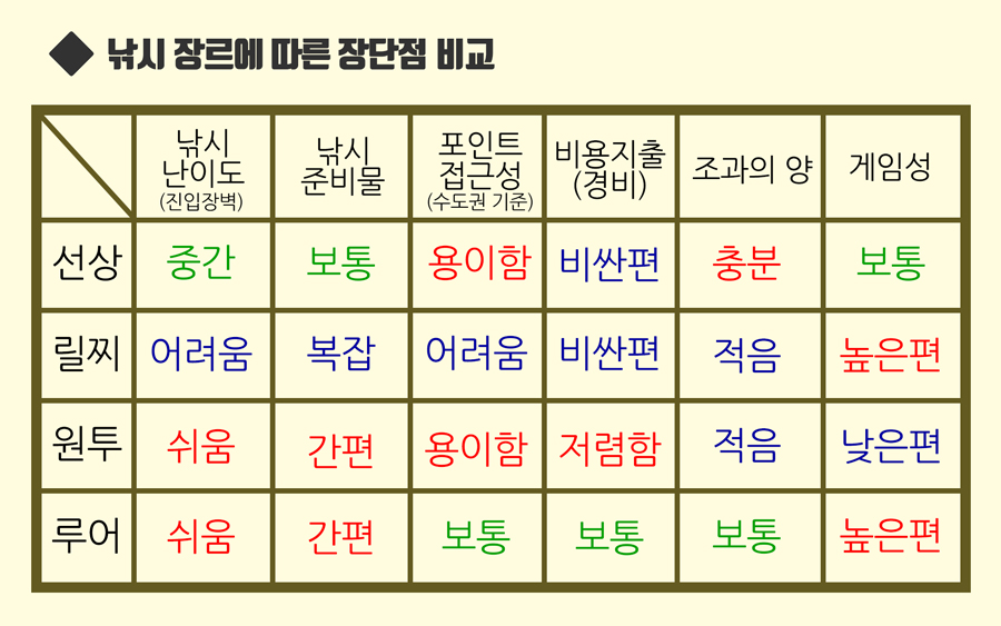 마지막으로 각 장르의 장단점을 비교한 도표로 글을 마무리하겠습니다. 다음 편에서는 원투 던질낚시에 관해 지역별 어종과 시즌 등 전반적인 개념을 짚어보도록 하겠습니다.
