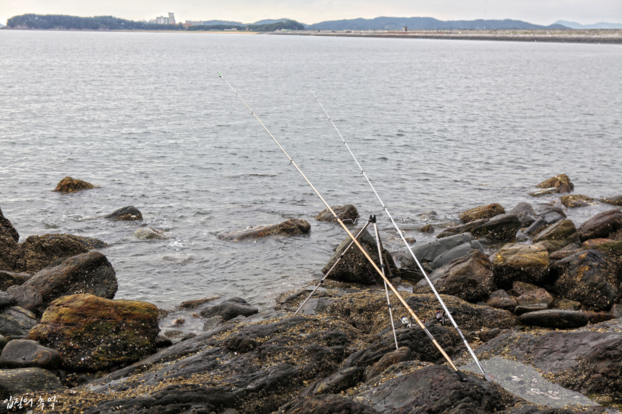 원투낚시가 행해지는 곳은 방파제. 여기서도 내항 석축과 외항 테트라포드로 나뉩니다. 외항은 테트라포드를 타고 내려가서 하는 낚시가 아닌, 발판이 안전한 시멘트 바닥에서 던집니다. 받침대에 올리고 2대의 낚싯대를 핀 다음(속칭 쌍포) 어신을 기다리는 식이지요.