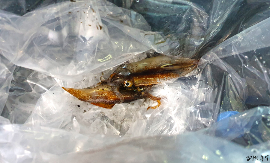 낚시를 마무리하고 다른 분들의 쿨러를 확인하는데 그야말로 처참했습니다. 이날 마릿수 장원이 새끼 살오징어(화살촉오징어) 4마리.