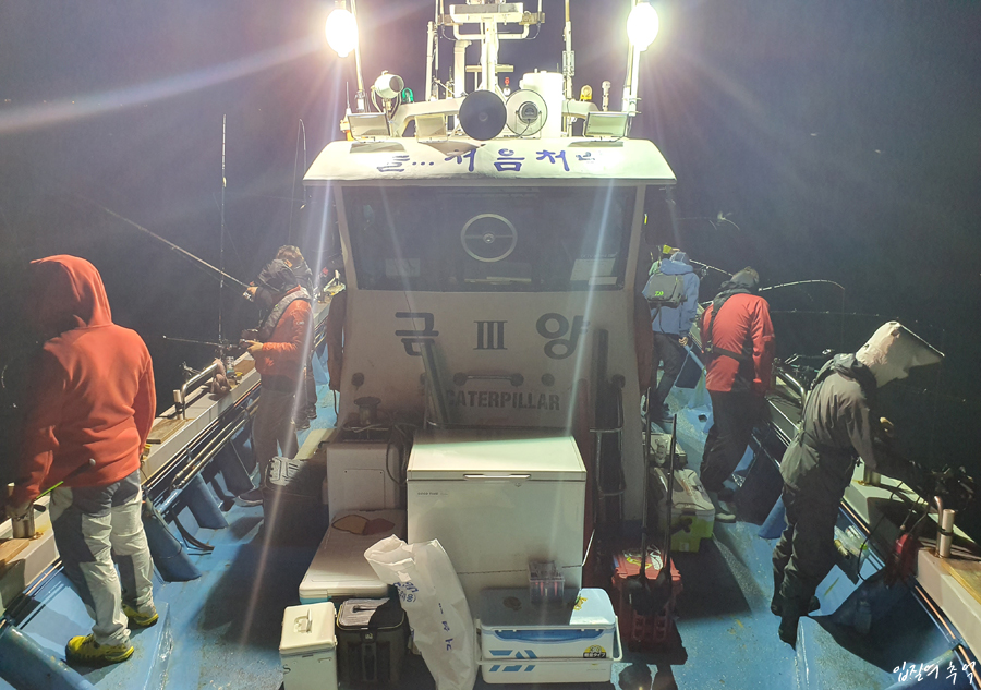 그 상태로 1시간 30분 동안 꼼짝없이 새우잠을 자며 가는데 멀미기도 올라오고, 졸리기는 엄청나게 졸리고, 아직 낚시 시작도 하지 않았는데 몸이 천근만근 무거운 겁니다. 속으론 걱정이 많이 됐습니다. 이런 몸 상태로 어떻게 밤을 꼴딱 새지? 게다가 포인트 주변은 파도가 셀 텐데..