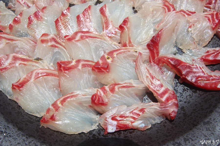 위 사진은 2013년 7월 초로 산란 전 벤자리를 회 뜬 것입니다. 보시다시피 벤자리는 능성어를 연상케하는 붉은 혈합육에 흰 살이 특징인데요. 여기서 중요한 것은 붉은 혈합육 위로 흰 지방층이 꼈는지를 보는 것입니다.