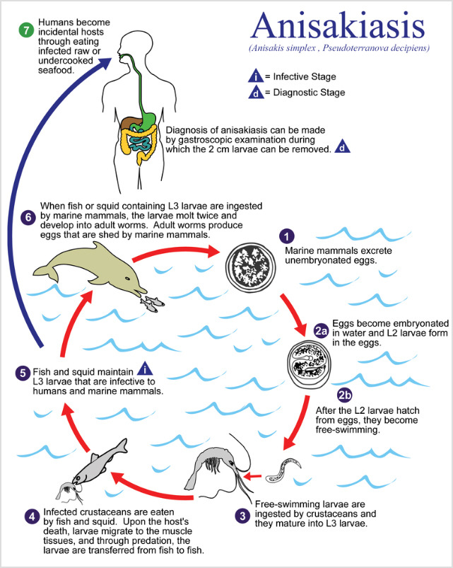 이후 고래회충은 먹이사슬에 의해 2차 숙주(작은 물고기)에 먹히고, 이후 더 큰 물고기에게 먹히며, 최종적으로는 고래에 먹힘으로써 성체로 자라나게 됩니다. 이러한 생활사는 지난 수만 년 동안 무한 반복되었으며, 중간에 인류가 개입(어획 및 식용)함으로써 본래 해양 생물에서만 기생하던 고래회충은 이제까지 만나본 적 없는 새로운 환경(담수로 구성된 인체)에서 생을 마감하거나 부작용을 일으키게 됩니다.