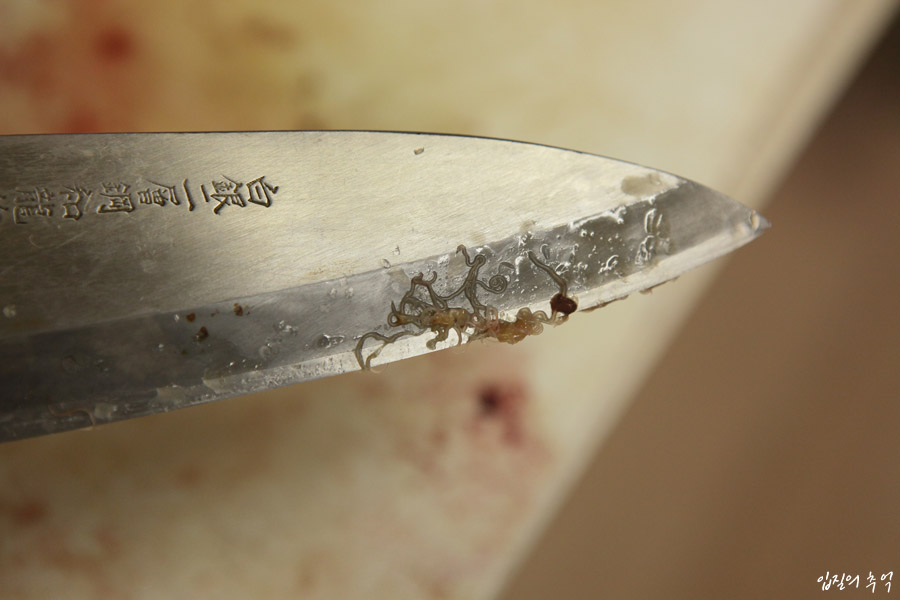칼과 도마 하나로 전처리와 내장 손질, 포 뜨기와 회 썰기까지 모든 과정을 처리한다면, 간혹 고래회충이 칼과 도마를 통해 살에 옮겨 붙을 수도 있습니다. 비단 고래회충 때문이 아니더라도 여름에는 회를 먹고 식중독에 걸리는 사례가 빈번한 만큼 칼과 도마는 철저히 분업화해야 하는데 아직도 일부 재래시장과 좌판 등에는 위생관념과 동떨어진 방법을 고수하고 있어서 문제가 됩니다.