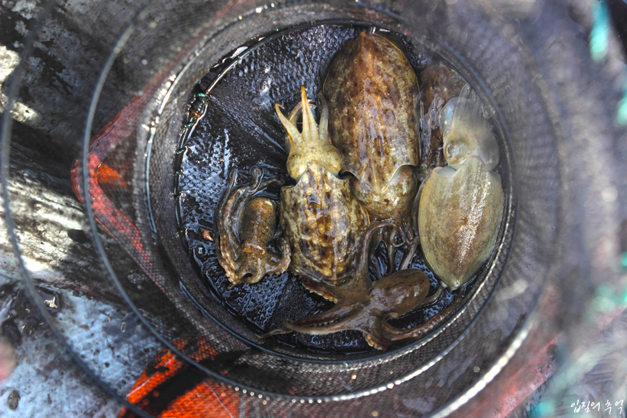 갑오징어와 주꾸미는 잡은 즉시 쿨러로 직행하기도 하지만, 횟감을 염두해 철수 때까지 살려 두고 싶다면 선사에서 제공하는 망태기 형태의 개인 어창에 살려 두는 것이 가장 좋습니다.