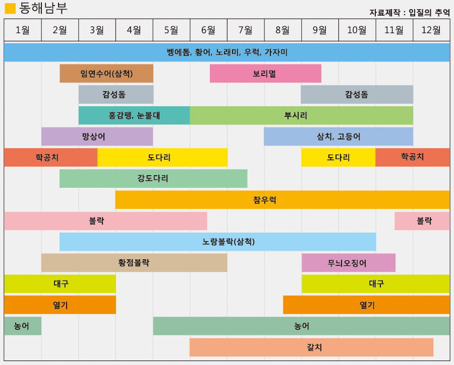 그만큼 어종이 다양하며, 계절마다 잡히는 어종도 뚜렷합니다. 횟감용으로 쓰이는 고급 어종보다는 반찬감 장만에 유리한 어종이 다양하게 포진됐다는 점도 동해의 특징입니다.