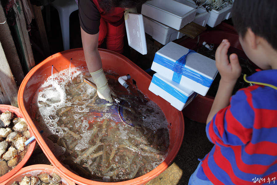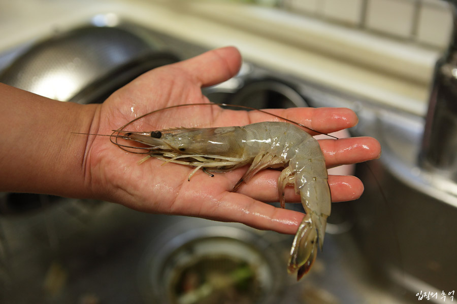 사진과 같이 대야나 수조에 살아있는 새우는 모두 양식이란 점, 참고하세요. 자연산 대하와의 맛 차이는 크게 없습니다. 오히려 산 새우라 육질이 탱글탱글합니다.