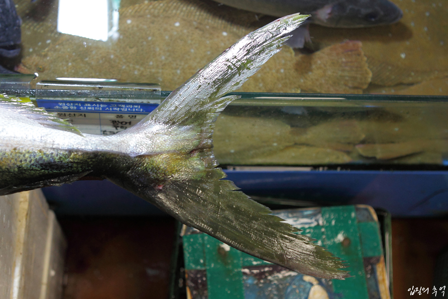 우선 횟감 종류를 잘 모르는 소비자 입장에서는 방어나 부시리나 거의 비슷하게 보일 것입니다. 그럴 때는 꼬리지느러미를 봅니다. 방어의 꼬리지느러미 라인은 직각으로 각이 졌습니다.