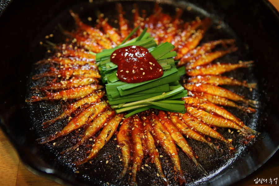양념이 들어간 이후로는 불을 약불로 맞춥니다. 빙어가 작아서 오랫동안 구울 필요는 없습니다. 부추와 양념장을 올리고 팬에 있는 채로 내면 빙어 도리뱅뱅이 완성됩니다.