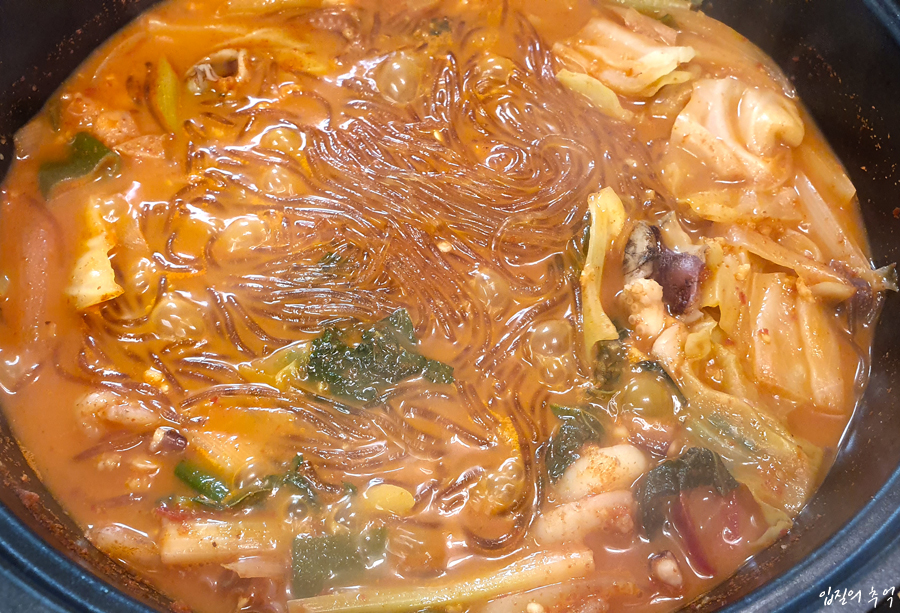 팔팔 끓으면 낙지로 육수를 낸다 생각하고, 중불에 5분간 더 끓여줍니다. 마무리로 물에 불린 당면을 넣고 마무리합니다. 당면은 물에 적당히 불릴 것을 추천합니다.