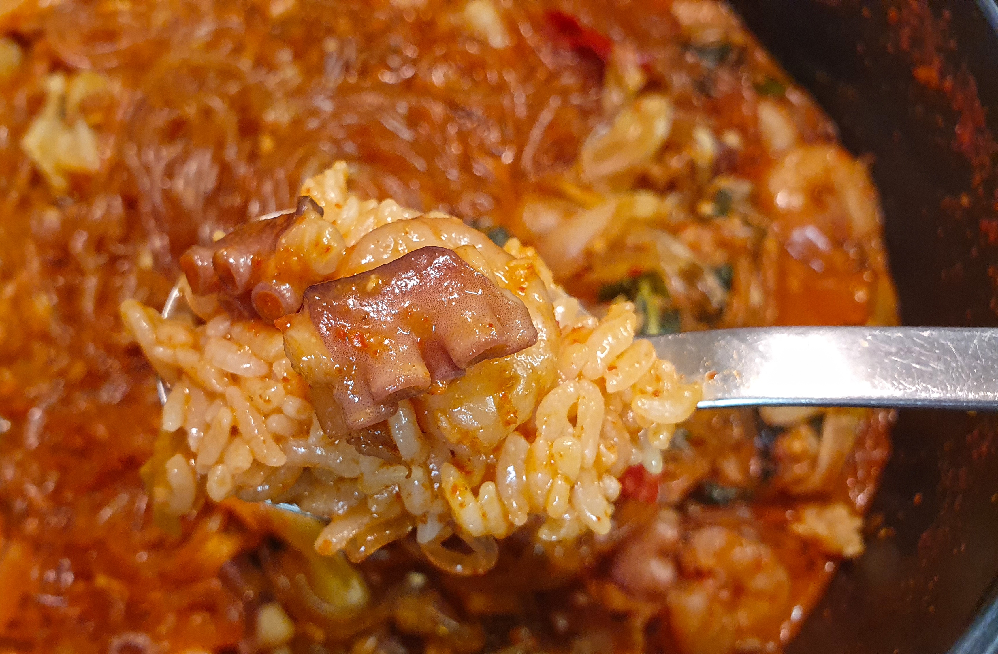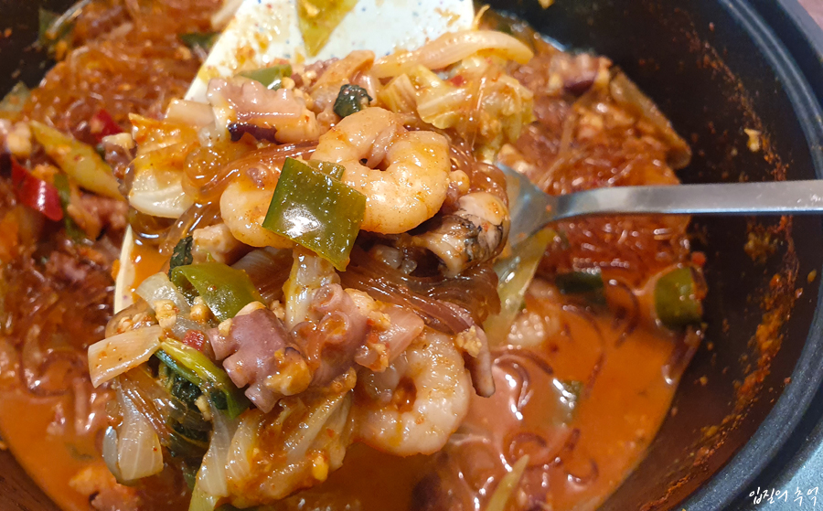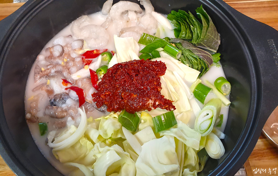 약불에 조리면서 점점 진해집니다. 육수 맛도 처음 먹었을 때보다 낙지와 새우 맛이 좀 더 배어나온 형태로 이때가 가장 맛이 좋아집니다.