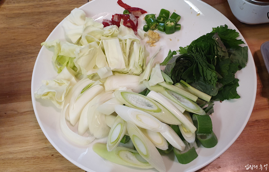 낙지 2마리, 깐새우 적당량, 양배추 조금, 대파 1대, 깻잎(또는 방아잎) 조금, 매운고추 1개, 붉은고추 1개, , 당면(혹은 우동사리), 사골육수