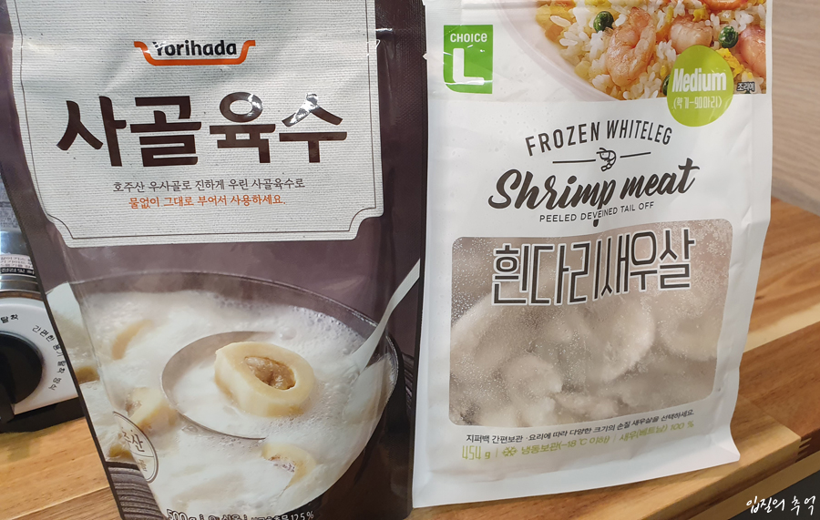 시판되는 사골육수와 새우살도 함께 준비합니다. 여기까지 했다면 조방낙지는 거의 완성된 것이나 다름 없습니다.