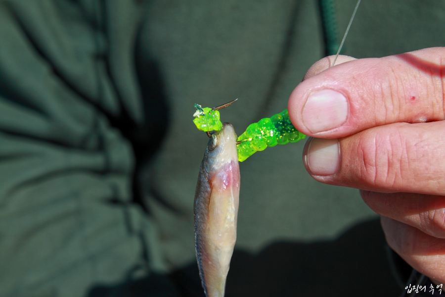 채비는 웜을 이용한 루어낚시입니다. 그런데 뜻밖에도 생미끼를 끼웁니다. 여기서 웜은 생미끼가 바늘에서 빠져나가지 않도록 고정하기 위한 도구로 사용했습니다. 이곳 캐나다는 미늘 있는 바늘(훅셋)을 사용하면 벌금을 물기 때문에 물고기를 위해서라도 미늘 없는 바늘을 씁니다.