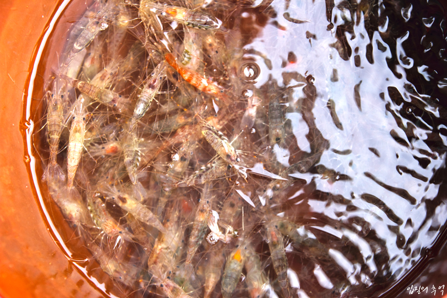 빈사 상태에 놓인 새우는 처음 몇 분 동안 움직임이 없지만, 실온에서 점차 회복되어 움직임이 살아납니다. 급기야 손바닥에서 퉁겨지며 펄떡거리기도 합니다. 산지에서 잡힌 보리새우가 서울, 수도권의 한 가정집에서 생새우 회로 이용되는 시대가 온 것입니다.
