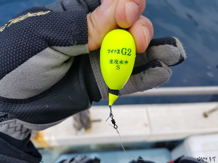 외해권에서 찌 흘림 낚시를 하려면 거센 조류에 찌가 멀리 흘러가지 않아야 합니다. 마이너스 찌는 말 그대로 부력이 아닌 침력으로 가라앉히는 잠길 찌입니다. 갯바위에서는 흔히 투제로(00)나 쓰리제로(000)를 이용해 잠길찌 조법을 쓰지만, 선상에서의 환경은 그보다 더 빠르고 강한 조류가 흐르기 때문에 찌가 조류를 타고 자연스럽게 흘러가면서도 다양한 수심층을 탐색할 수 있어야 합니다.