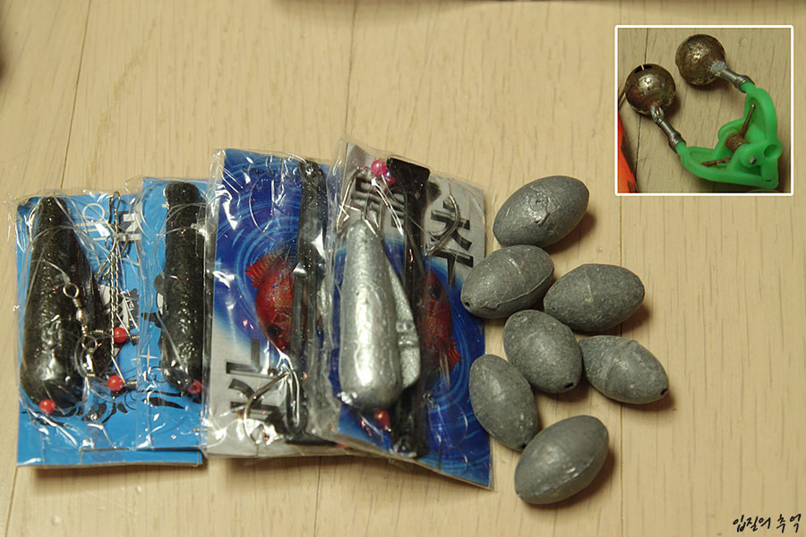 묵음추 채비는 봉돌에 바늘 3개가 달린 채비로 이것이 갯바위, 방파제, 좌대에서 전천후로 이용되는 원투 던질낚시 채비입니다. 여기에 갯지렁이나 오징어살을 꿰면 되는데 지형이 험한 곳은 맨 아랫 바늘이 걸리거나 뜯길 수 있으니 잘라내어 바늘 2개로 운용하는 것도 방법입니다.