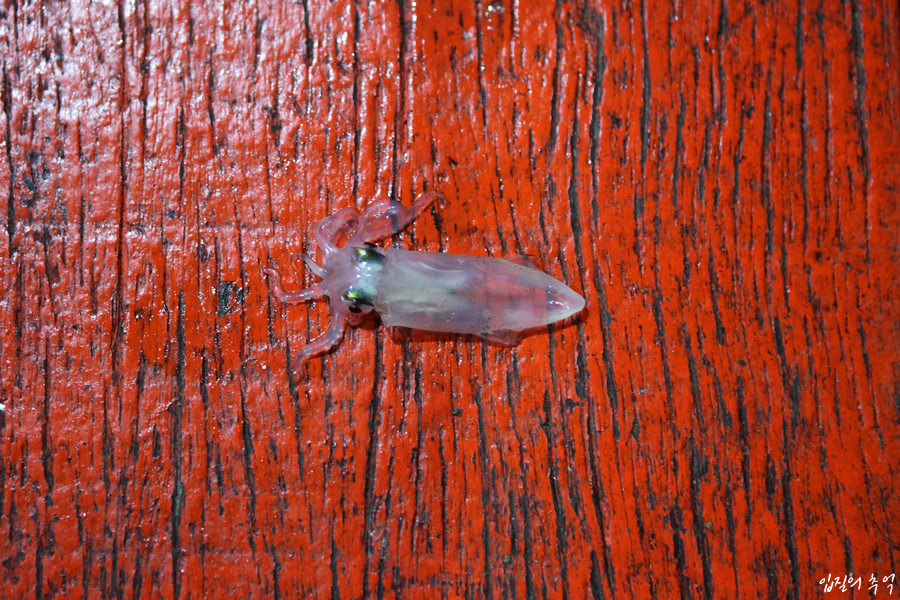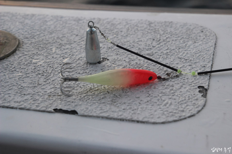 여기에 추를 달아서 바닥으로 내리는데 일단 바닥을 찍으면 확 들지 말고, 들더라도 한 뼘 이상 들지 않은 상태에서 낚싯줄로만 까딱까딱하는 식으로 고패질을 줍니다. 여기서 고패질은 상하운동으로 올렸다 내렸다 하는 건데 문어 낚시에서는 그 간격이 한뻠 정도일 만큼 제한된 움직임을 주는 것이 유리합니다.