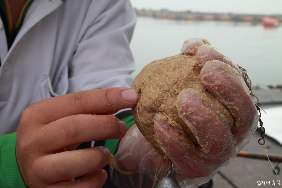 이때 예닐곱의 바늘은 모두 떡밥 안으로 숨깁니다. 이 상태로 채비를 바닥으로 내리면, 그 상태로 베일을 닫고 줄을 살짝 팽팽히 한 채로 숭어 입질을 기다리는 식입니다.
