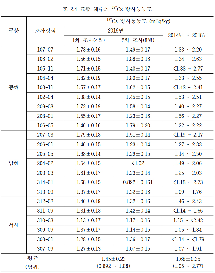 조사 결과는 해역에 따라 상이하나 후쿠시마 원전수가 대량으로 유출된 2012년부터 현재까지 한반도 해역의 방사능 농도는 이렇다할 증가폭을 발견하지 못했습니다.