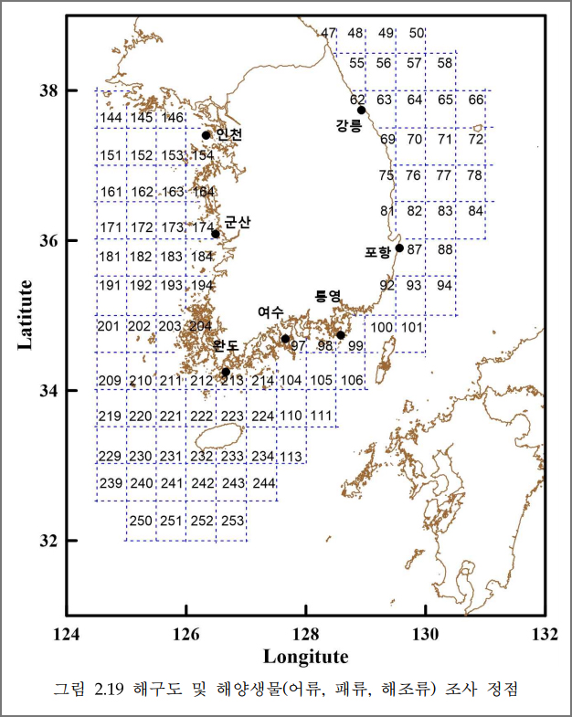왼쪽과 아래에 표시된 숫자는 위도와 경도이며, 해구도 및 해양생물 조사 정점을 표시한 것이니 참고만 하고 다음으로 넘어가겠습니다.