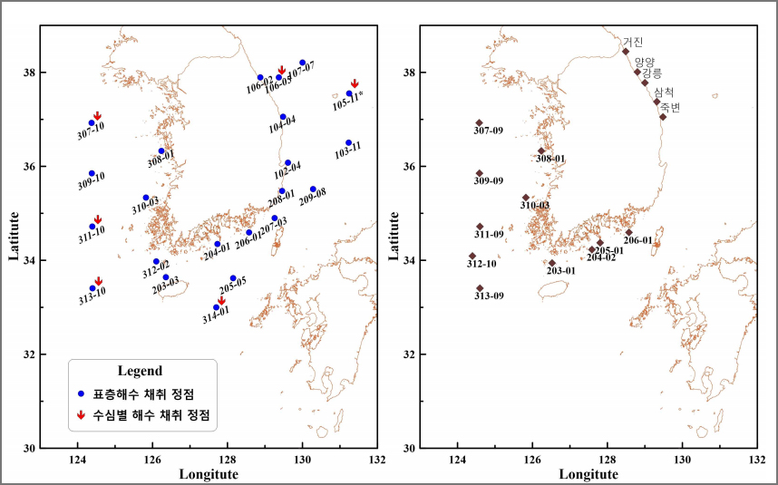 위 도표는 수심별 바닷물을 채취한 정점을 표시한 겁니다. 파란색 점은 표층수이고, 붉은색 화살표는 해수 채취 정점입니다. 주의 깊게 볼 만한 자료는 아니므로 다음으로 넘어갑니다.