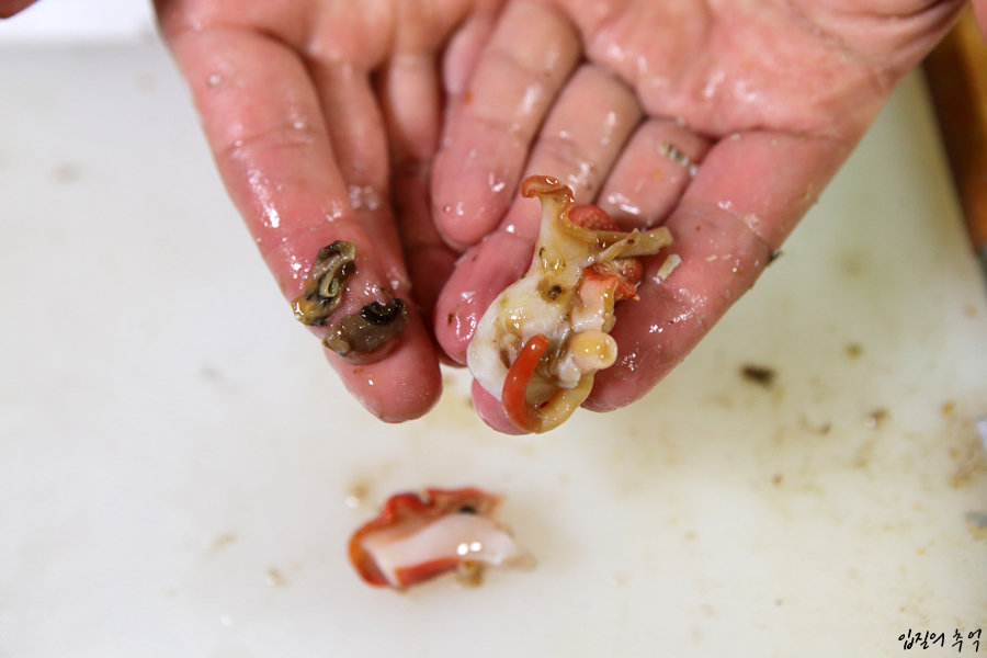 2) 내장을 제거하고(식용 불가), 살만 선별합니다.