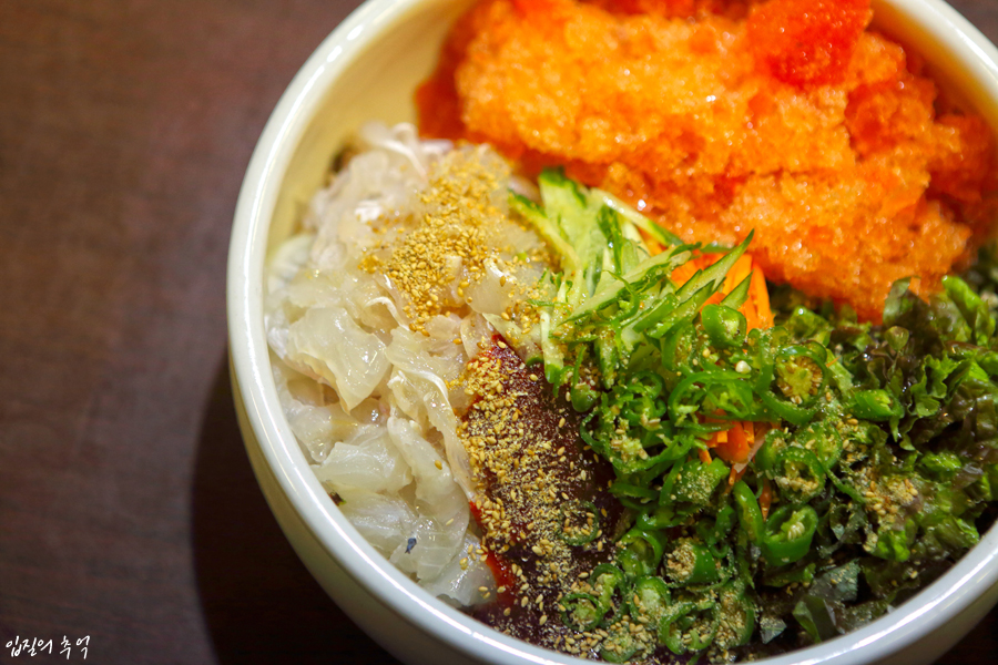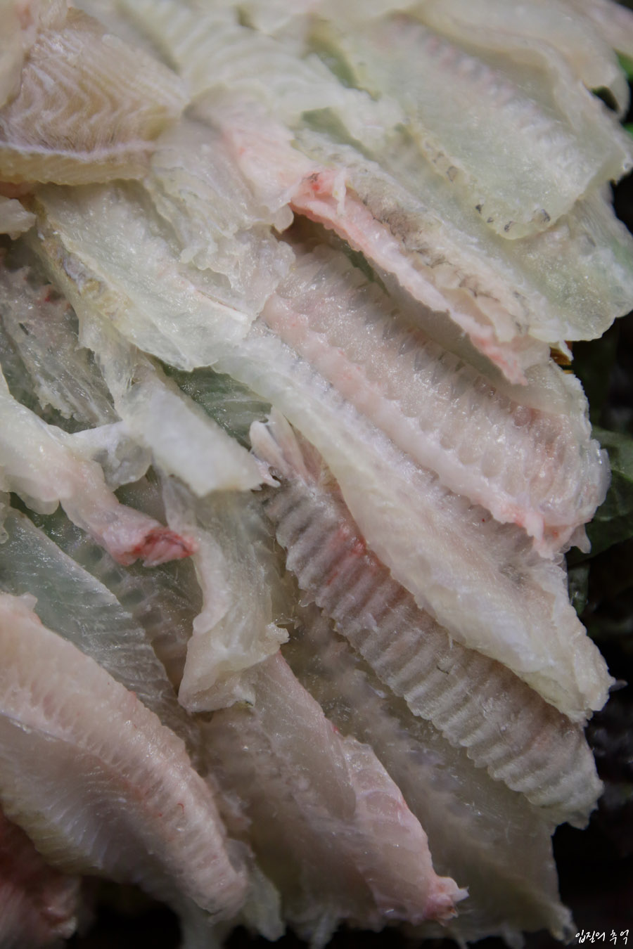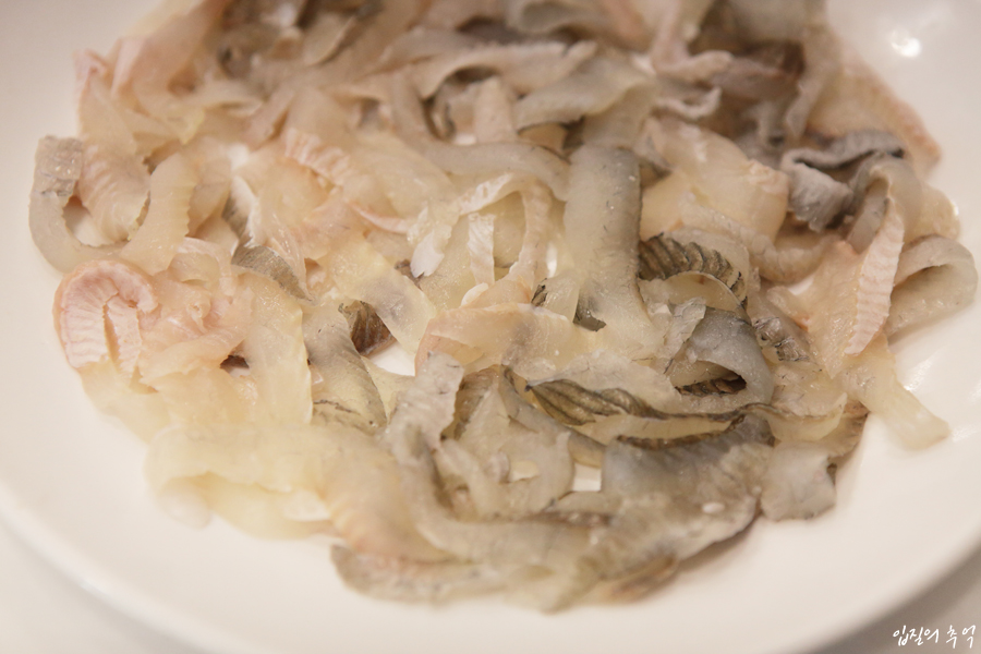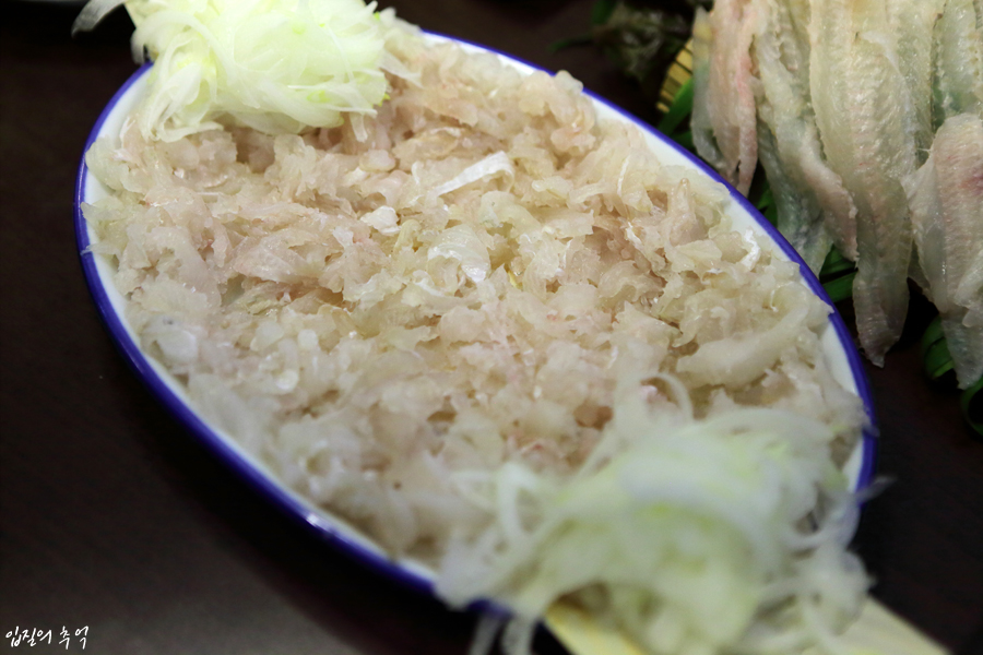 써는 방향에 따라 뼈 식감을 살릴수도, 반대로 즙을 살릴 수도 있기 때문에 칼질에 따라 변화무쌍한 맛을 즐기는 고급 생선회라 할 수 있습니다.