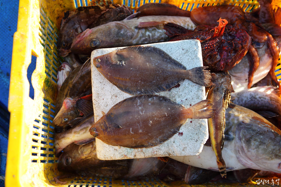 앞서 거론한 가자미과 어류 중 평균 크기가 가장 작은 참가자미는 주로 속초일대를 비롯해 강릉, 삼척, 포항에 이르기까지 동해안 전지역에서 만나볼 수 있는 가자미입니다. 표준명은 참가자미지만, 지역에 따라 노랑가자미, 노랭이로 불리기도 합니다. 이유는 뒤집었을 때 배에 노란 띠가 선명하기 때문인데요.