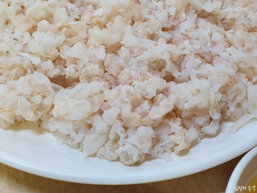 그러한 이유로 붕장어를 회 뜰 때는 물에 충분히 빨고 탈수기에 넣고 돌려 수분기를 뺍니다. 뽀송뽀송해진 붕장어는 뼈째 써는데 얇고 가늘게 썰어낸 모습이 마치 눈꽃 빙수를 연상케 합니다. 잘게 친 붕장어회는 그냥 먹는 것도 좋지만, 깻잎과 초장에 싸서 먹으며, 콩가루를 뿌려 다양한 채소와 함께 회무침으로 이용하면 별미입니다.
