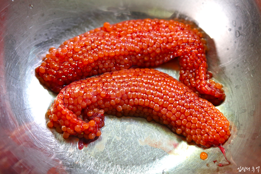 사진은 국내로 회유하는 연어(Chum Salmon)인데요. 같은 종이지만 바다에서 잡힌 연어와 하천에서 잡힌 연어는 언뜻봐도 다른 종이라 할 만큼 상반된 모습을 가집니다. 이들 연어는 일부 알젓으로 가공이 되지만, 산란철이 시작되면 대부분의 암컷 연어에선 성숙된 알을 가집니다.