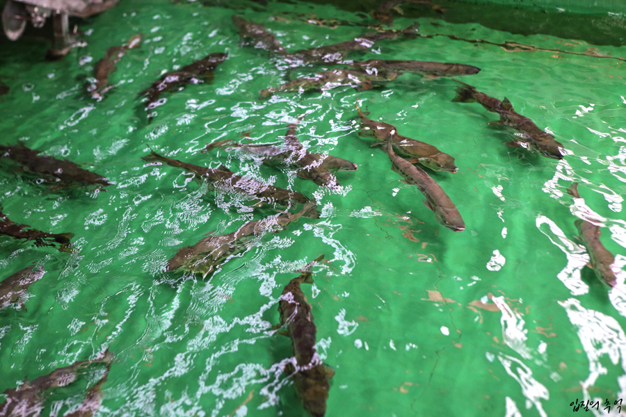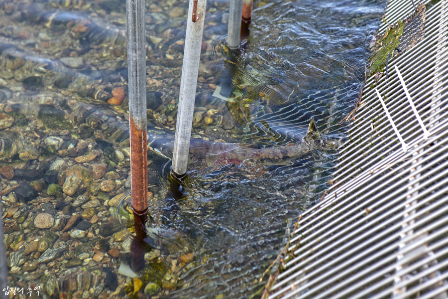 보통은 수중보를 넘어 상류로 가야할 연어들이지만, 이렇게 철제펜스로 막아 상류로의 유입을 최소화했는데요. 그럼에도 불구하고 연어의 끈질긴 모천 회귀를 막을 방도는 없었습니다. 그나마 펜스를 설치해서 거슬러오는 연어의 일부라도 생명자원센터로 유입시켜 인공부화와 방류를 했던 것입니다.