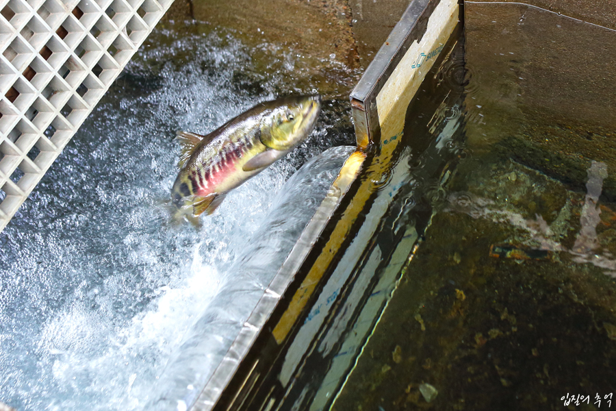 유도로 안쪽은 제법 높은 구조물로 가로 막혀 있는데요. 이는 연어가 힘껏 점프해서 소상하는 본능을 이용한 것으로, 이렇게 해야 센터로 들어온 연어는 산란장에 가까워짐을 직감해 알을 낳을 수 있도록 하기 위함입니다.