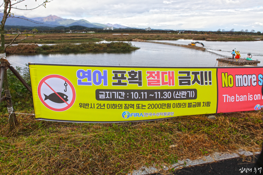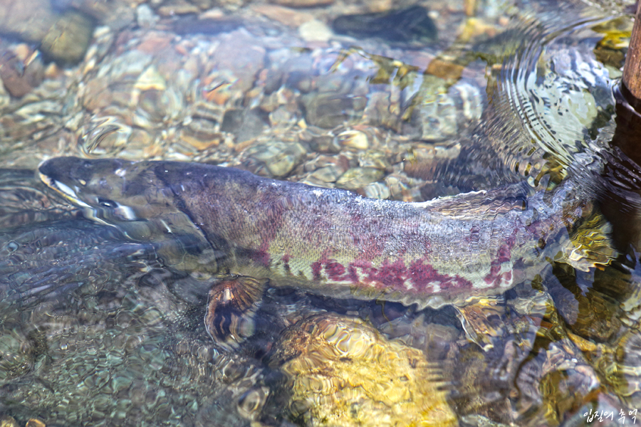 하지만 막상 현장에 가면 이를 위반하고 낚시하는 사람들이 종종 보여 눈쌀을 찌푸리기도 합니다. 특히, 상류로 거슬러 오면 수심이 얕고 자갈밭으로 되어 있어 연어의 산란장으로 최적의 환경을 제공하는데요.