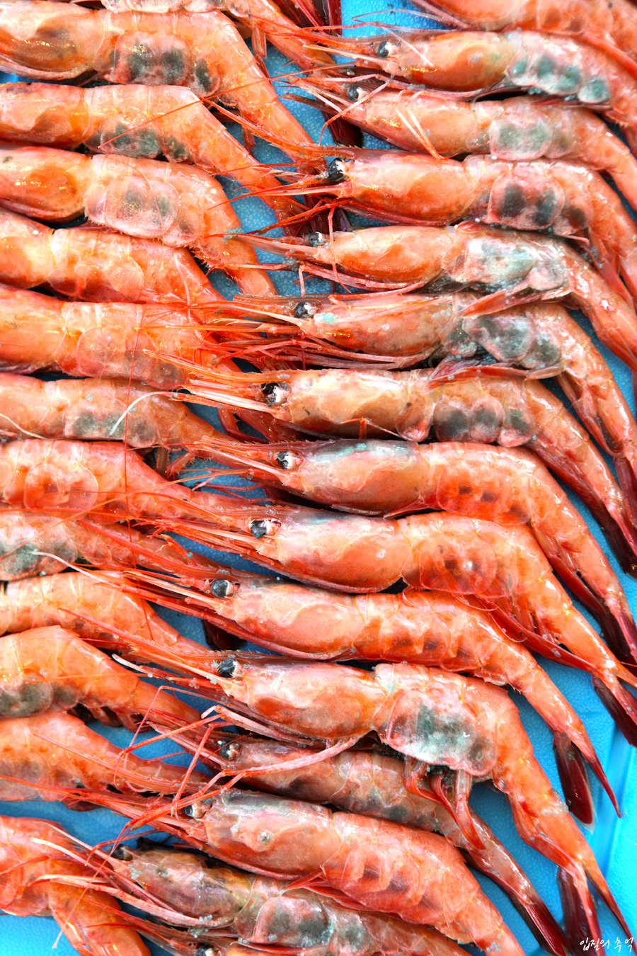 (가슴 쪽에 푸른색이 선명히 비치는 것이 싱싱한 단새우입니다. 반대로 새우는 내장부터 상합니다. 싱싱하지 않을수록 가슴팍과 꼬리 쪽이 검게 변합니다.)