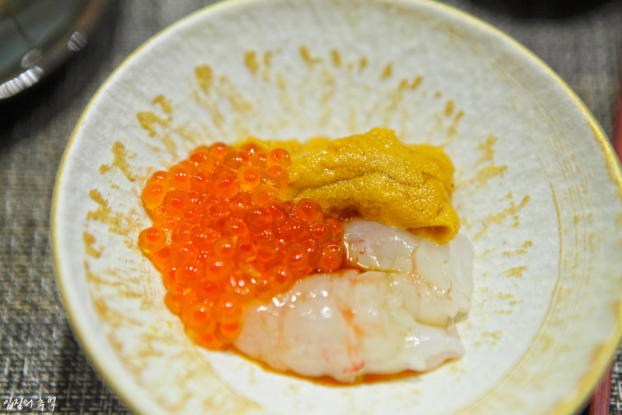 단새우의 청록색 알은 그 자체만으론 별다른 맛이 나지 않지만, 초밥에 고명으로 얹어 먹으면 톡톡 씹히는 식감과 특별한 맛을 느낄 수 있습니다. 이 외에도 지라시스시를 비롯해 감태, 성게알과 조합된 한입 요리로도 사용됩니다.