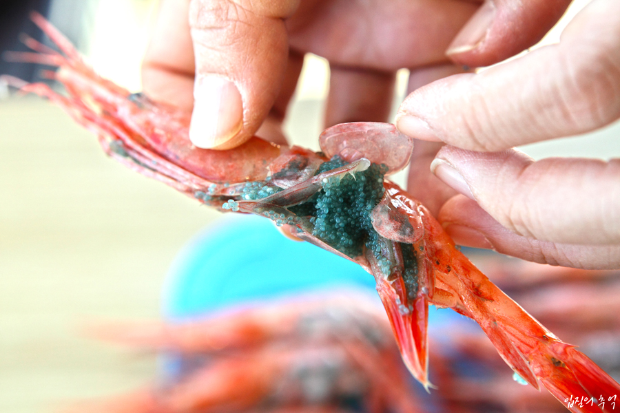 단새우의 경우 한번 알을 품기 시작하면 일 년 가까이 품기 때문에 붉은색과 대비되는 청록색 알덩어리를 심심치 않게 봅니다. 이렇듯 단새우의 고유한 빛깔이 선명할수록 품질이 좋고 싱싱한 것이라 할 수 있습니다.