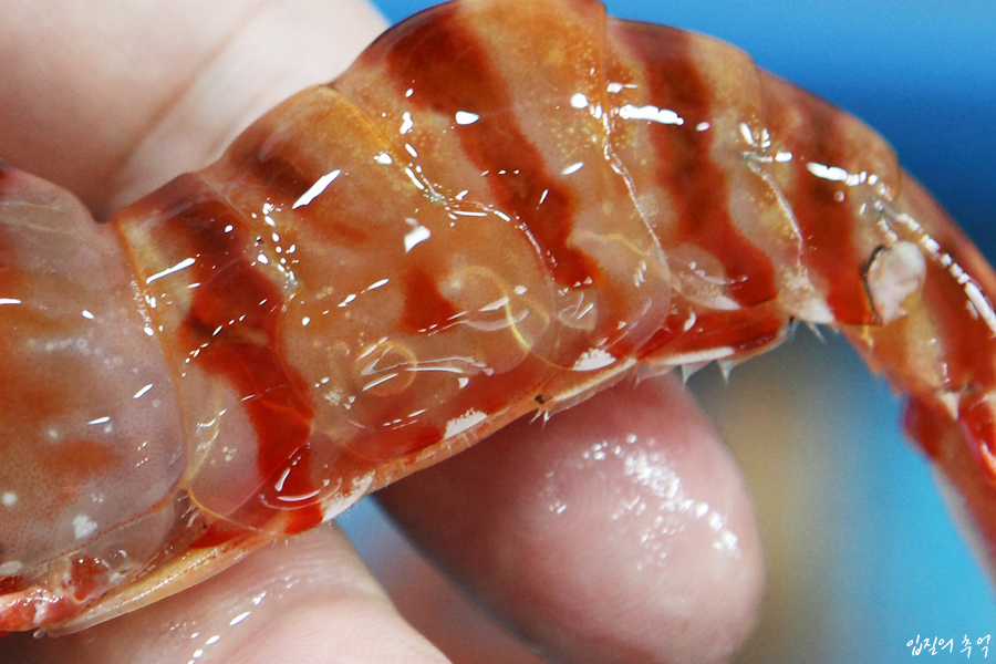 잘 보면 마디별 껍질이 순서대로 덮고 있음을 알 수 있습니다. 알도 배 밖으로 품지 않고 체내에 만들어 뿌리는 식입니다. 대표적인 종이 대하, 흰다리새우, 보리새우, 수염대롱새우(달마새우) 등이 있습니다.