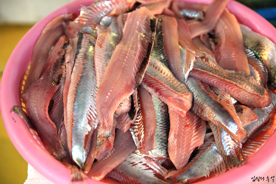 보통은 식당 납품용으로 물회나 회무침 용도에 맞게 막썰이 회로 손질해 바구니 단위로 팔기도 합니다. 참고로 청어는 가을에서 겨울 사이가 제철이며, 구이는 잔가시가 많은 게 흠이지만, 잘게 썰어낸 회는 그렇게 가시가 씹히지 않으며 가격 대비 기름진 고소함이 뛰어납니다.