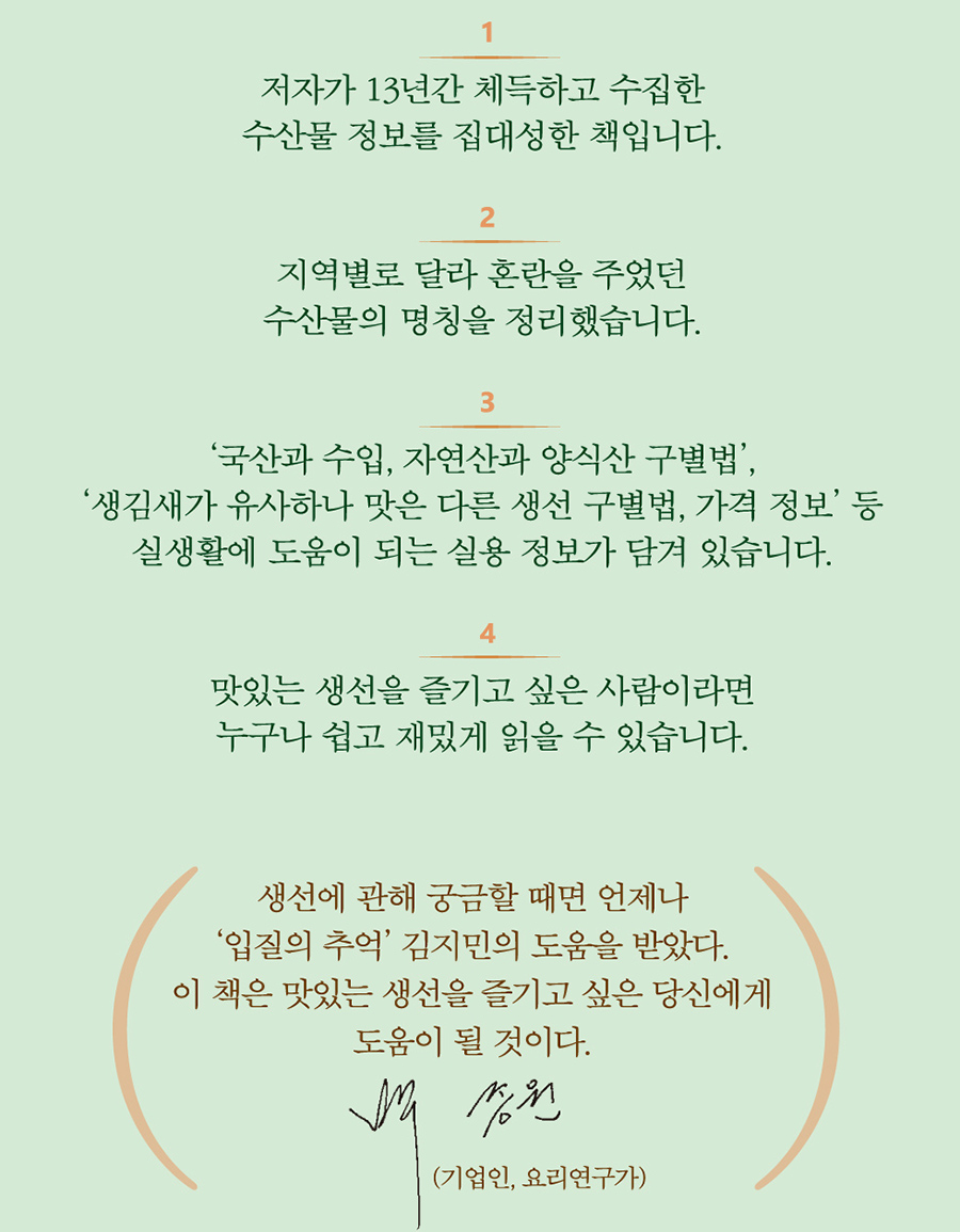 제가 이 책을 쓰게 된 가장 큰 이유는 ‘원물’을 다루는 수산물의 근본적인 이해를 생활 정보와 긴밀하게 연결시키는 데 있습니다. 현대판 자산어보라 할 수 있는 이 책을 통해 ‘원물’을 취급하고 다뤄야 할 업장과 식탁에 올리는 소비자들이 수산물을 종류별로 이해하는 데 도움이 되었으면 하는 바람입니다.
