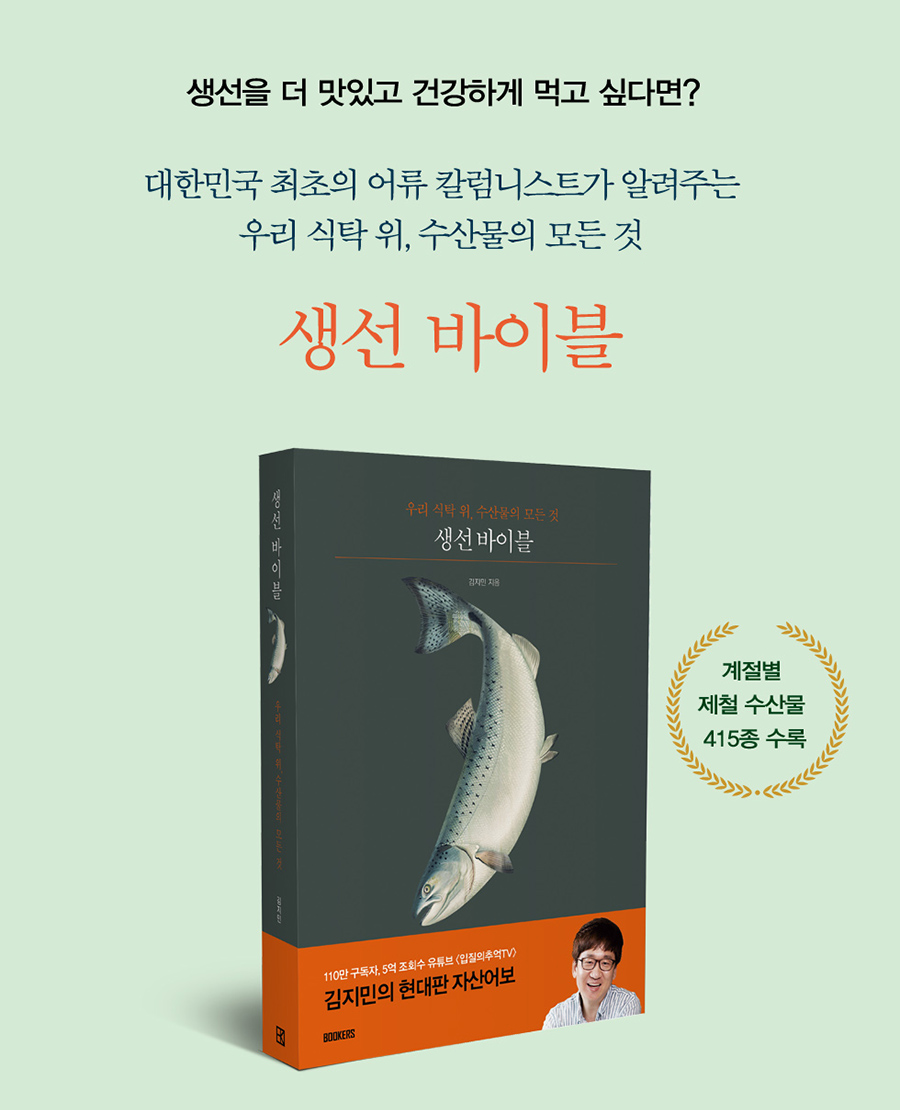 대한민국 최고의 수산물 전문가이자 최초의 어류 칼럼니스트 ‘입질의 추억’ 김지민이 신간 《생선 바이블》을 출간했다. 우리 식탁 위에 오르는 수산물 415종을 계절별로 나누어 소개하고 있으며, 제목처럼 생선에 관해 사람들이 알고 싶은 거의 모든 것을 담아냈다.